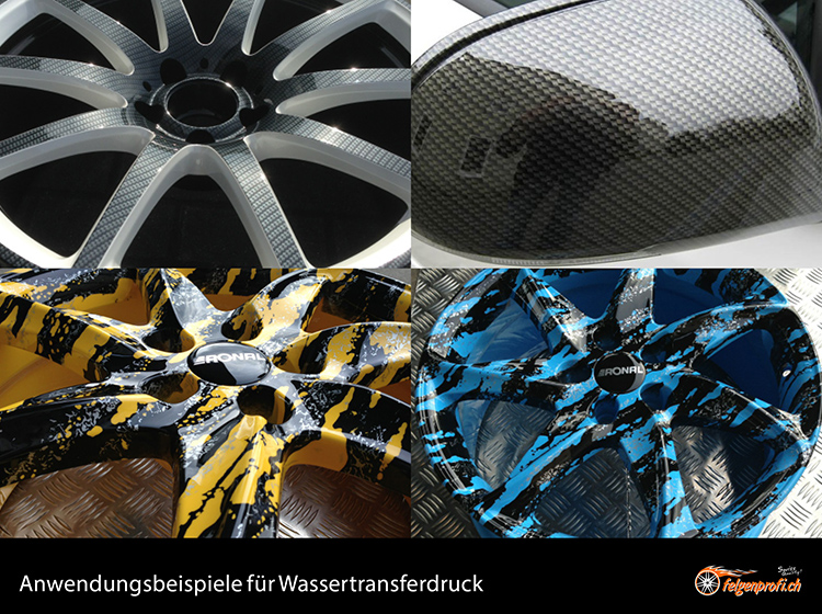 Sont reproduits par exemple des motifs sur des éléments intérieurs en recouvrant de ronces de noyer ou optiques carbone. Cette technique trouve son utilisation sur l'eau, l'air, l'espace aussi où par ex. le recouvrement des instruments de cockpit en raison de son gain de poids d'où l'utilité. Le transfert de pression d'eau est un procédé de traitement de surface pour appliquer des motifs et décors divers sur les objets formés en tridimensionnel. Un des plus gros domaines d'application est l'industrie automobile. Ainsi sont, par exemple, des pièces intérieures plaquées en bois de ronces ou optique carbone. Pour la marine, l'aviation, l'air ou l'espace cette technique est utilisée aussi.