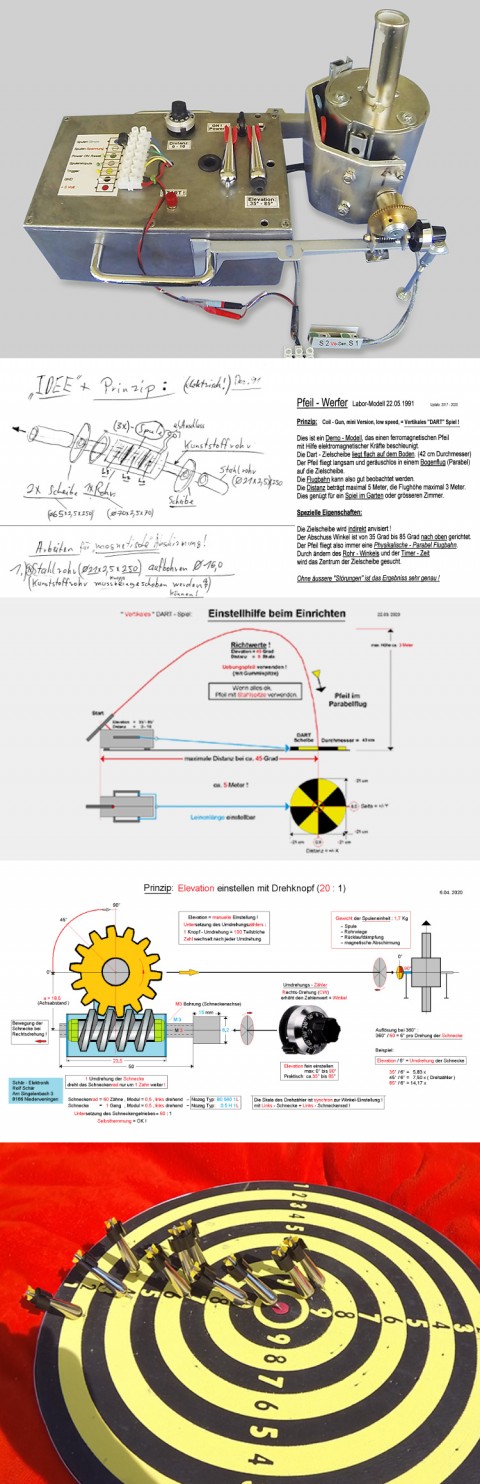 Der Ingenieur Rolf Schär entwickelte in seiner Studienzeit ein vertikales Dartspiel. Ferromagnetische Pfeile sollten mit Hilfe elektromagnetischer Kräfte beschleunigt, und über eine Distanz von zirka 5 Metern die am Boden liegende Dartscheibe treffen. Dem Projekt fehlte die Möglichkeit, die Flugbahnausrichtung einfach zu verstellen, und wurde deswegen wieder verworfen. Über 25 Jahre später erlebt das Projekt sein Revival.